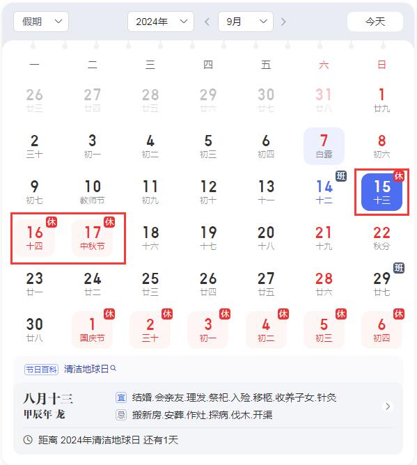 2024年中秋節(jié)放假時間安排: 9月15日(星期日)至7月17日(星期二)放假調休,共三天。9月18日(星期三)上班。