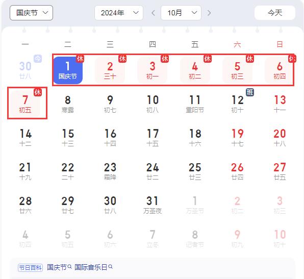 2024年國慶節放假時間安排: 10月1日(星期二)至10月7日(星期一)放假調休,共七天。10月8日(星期二)上班。